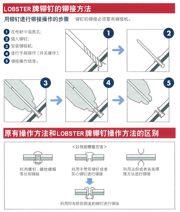 LOBSTER蝦牌鉚釘槍可應用於各(gè)種裝配工序中(zhōng),由(yóu)於可以從單側(cè)將多個母材一次性加以緊固,因此可(kě)以節省勞力,降低成本,提高作業速度,從而提高生產的合理性。